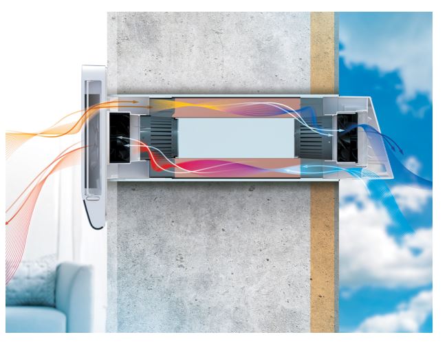 • Tryb odzysku ciepła – urządzenie jednocześnie nawiewa świeże powietrze i usuwa powietrze zużyte, korzystając z jednego otworu w ścianie.