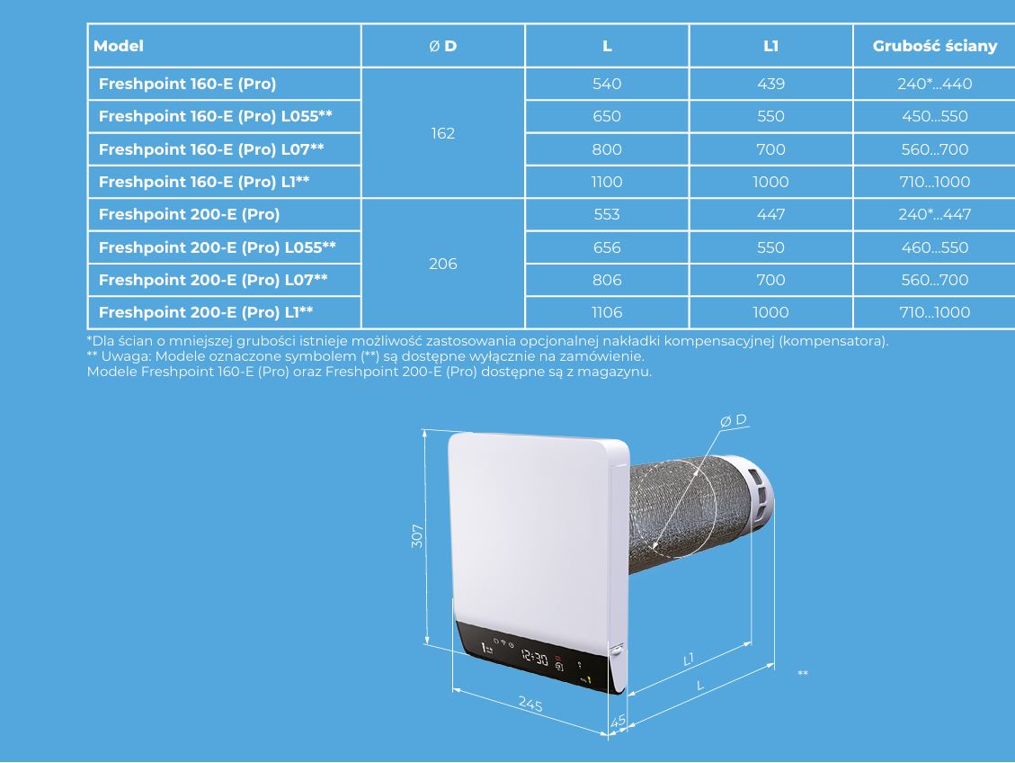 | Freshpoint 160-E PRO L07 | 15–57 m³/h (Boost 70) | 5–22 (bez grzałki) / 100 (z grzałką) | 220–240 V / 50–60 Hz | 50 | –30 | 12–42 dB(A) | G3 |