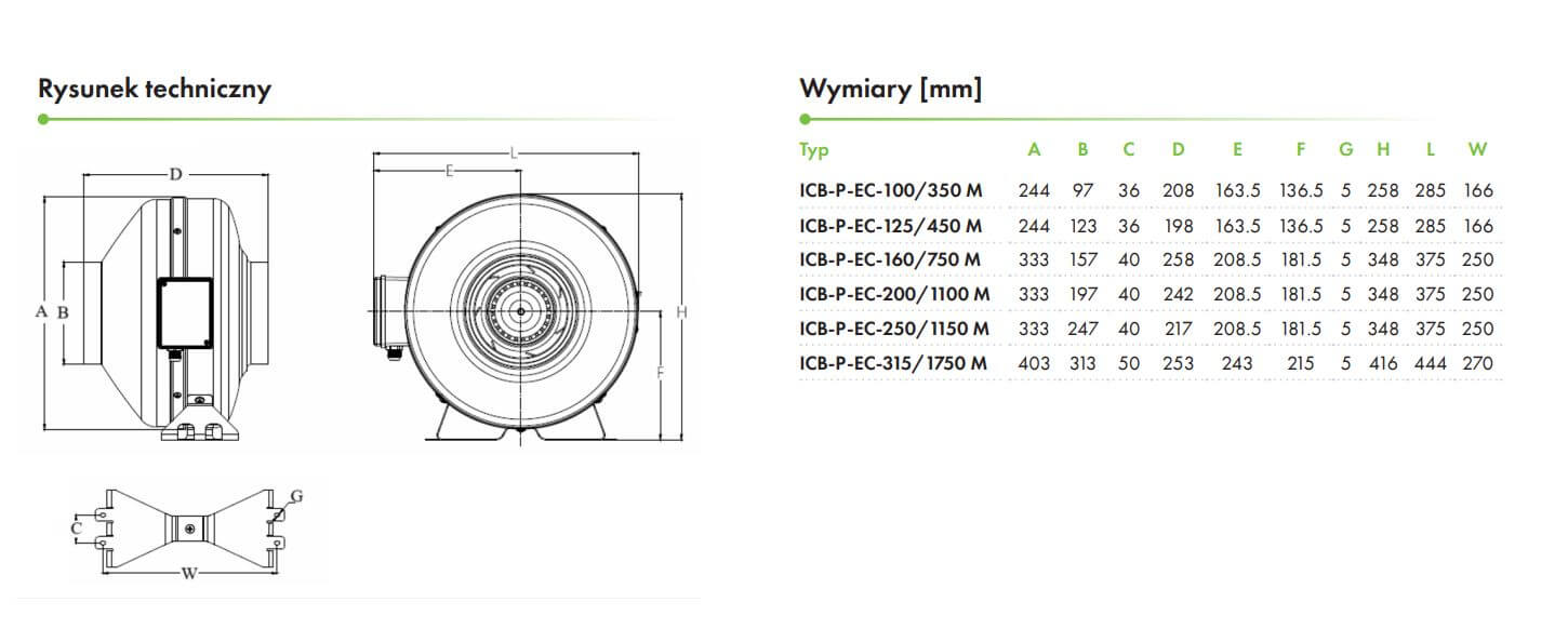 - Wentylator kanałowy, promieniowy. Obudowa wytłoczona z blachy stalowej malowanej proszkowo.