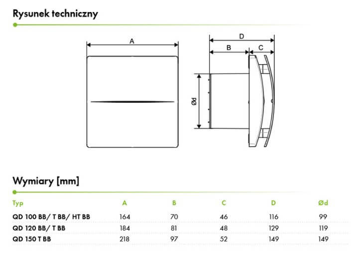 Wentylator QD jest przystosowany do wentylacji małych i średnich przestrzeni. Idealnie nadaje się do instalacji wyciągowych z łazienek, WC lub kuchni.
