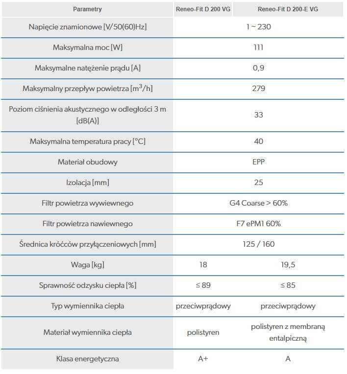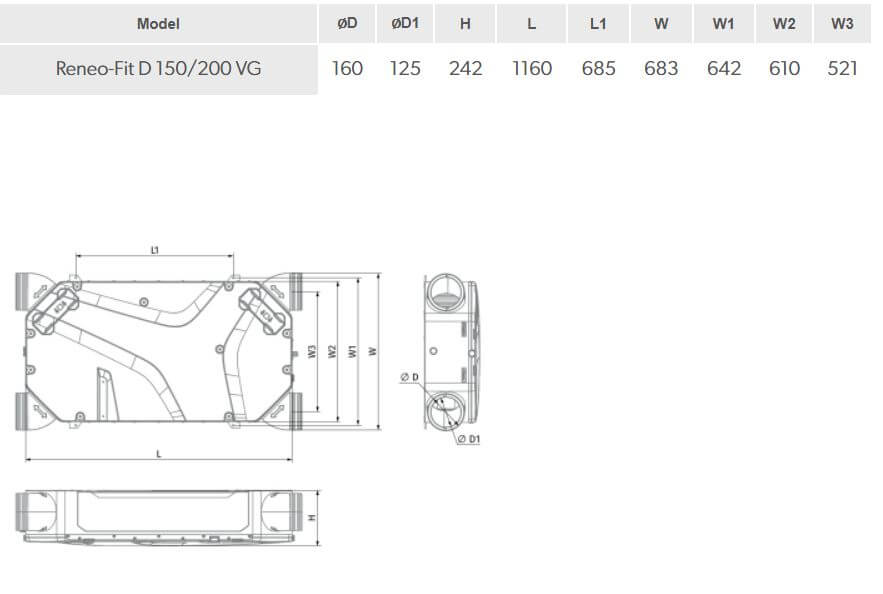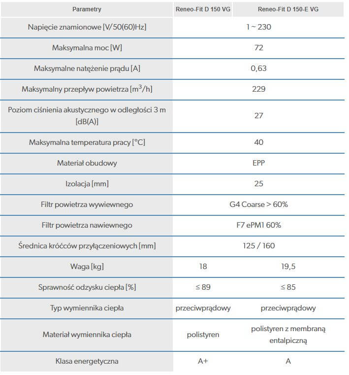 Obudowa wykonana ze spienionego polipropylenu (EPP) o wysokich właściwościach termoizolacyjnych i akustycznych osobno. Model Reneo-Fit D VG posiada regulowane króćce przyłączeniowe, zapewniające elastyczne rozwiązania montażowe